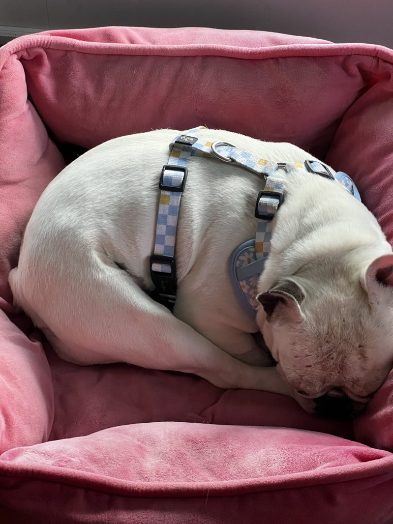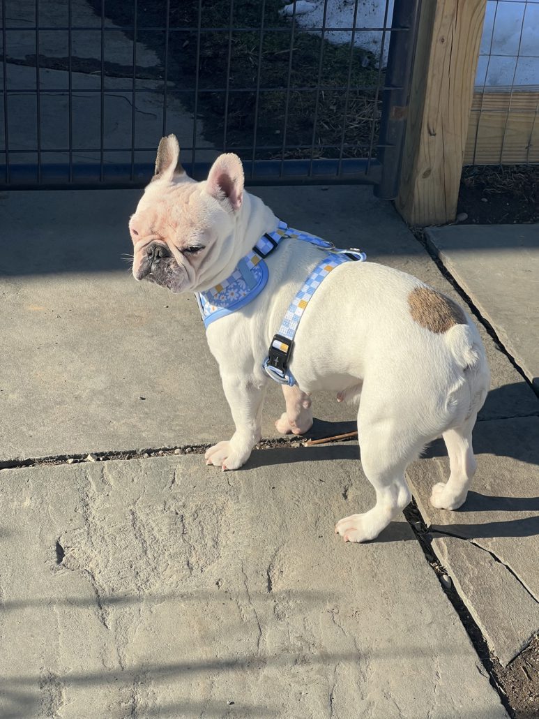 When Daisy first arrived, she was dealing with several common Frenchie concerns, including itchy skin, allergies, minor fungal ear infections, and some healing wounds on her head. With veterinary care, patience, medicated baths and a new diet, she made wonderful progress and is now more comfortable in her own skin…literally and figuratively.