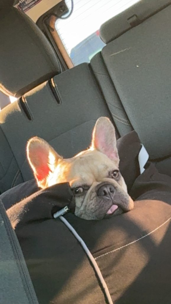 “Milano came to our family as an abandoned stray who was living at the humane society for a month. She was very loveable but very nervous and skiddish around everything new. She was absolutely terrified to go outside, to go up and down the stairs, and be left alone. She is currently loving her new foster life and is acting like the puppy she is. She loves to run and play with her foster frenchie sister. Milano now hops around the house like a little baby lamb, so excited about everything including going outside! She absolutely loves Jeep rides but mostly just loves to be with her person.”