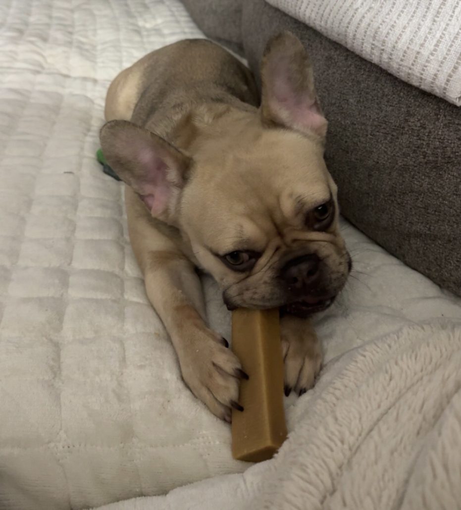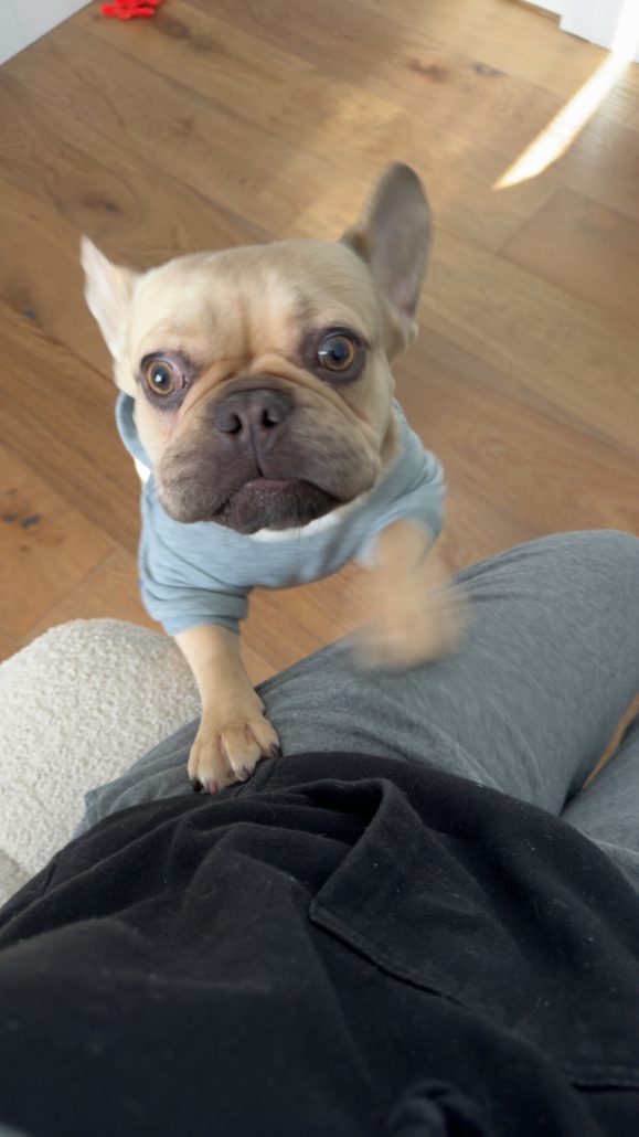 Like many Frenchies, Milano comes with a few maintenance notes. She has allergies that require regular Cytopoint injections and medicated baths, and she does have some prior medical history that adopters should be prepared to manage. She also eats like she is training for a competitive speed-eating event, so a slow feeder is a must.