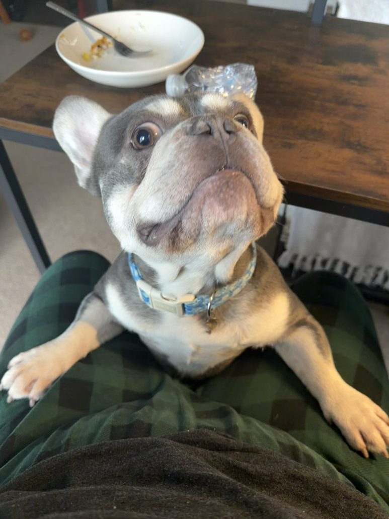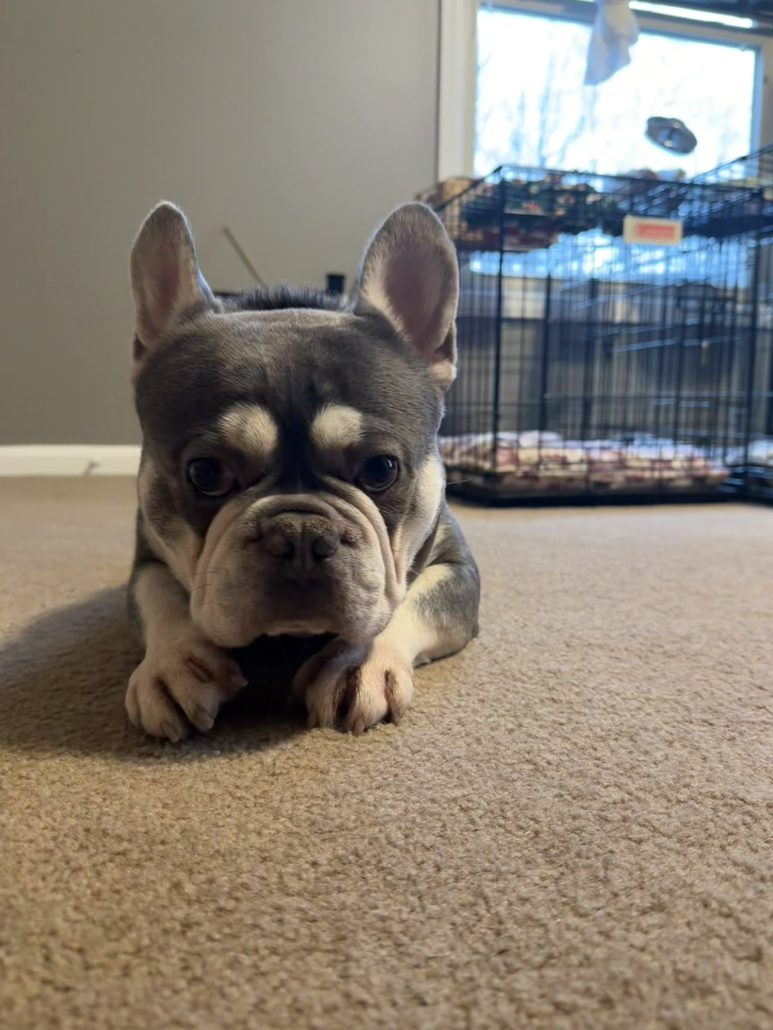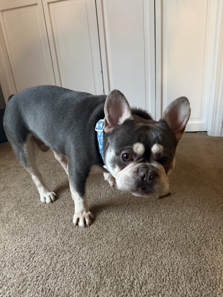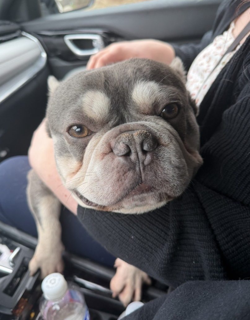 Picture it: an abandoned teddy bear sitting alone, wearing a blue duffel coat and red bucket hat with a sign around his neck saying “please take care of this bear.” Any reasonable person would pick that bear right up and take him home. And that’s exactly what FBRN did when they received a plea from an animal shelter for an abandoned three-year-old Frenchie named Paddington.
