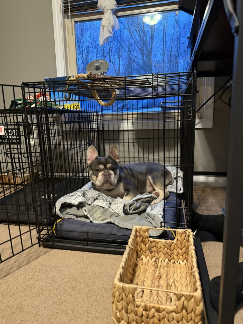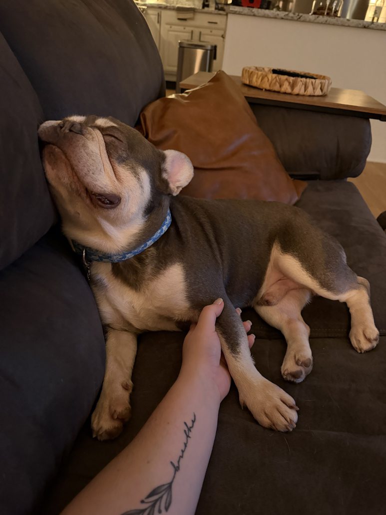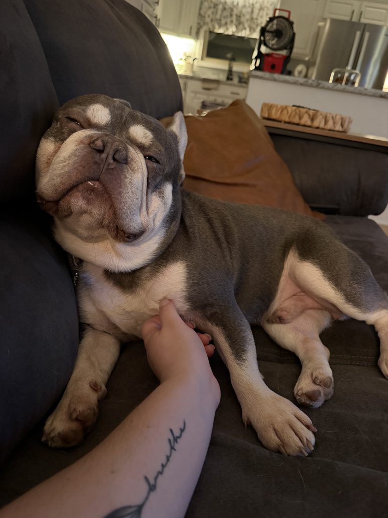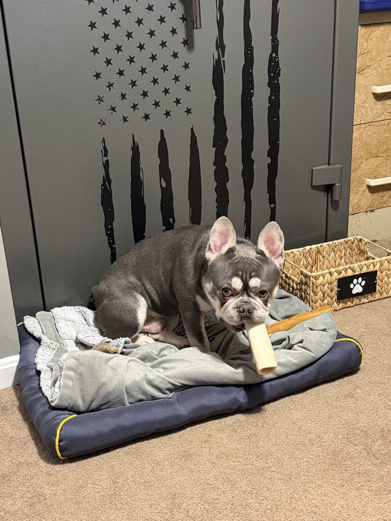 Picture it: an abandoned teddy bear sitting alone, wearing a blue duffel coat and red bucket hat with a sign around his neck saying “please take care of this bear.” Any reasonable person would pick that bear right up and take him home. And that’s exactly what FBRN did when they received a plea from an animal shelter for an abandoned three-year-old Frenchie named Paddington.
